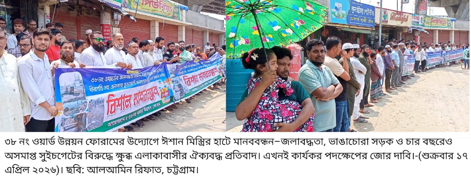 নিউজগার্ডেন ডেস্ক: চট্টগ্রাম সিটি কর্পোরেশনের আওতাধীন ৩৮ নং ওয়ার্ডের ঈশান মিস্ত্রির হাট এলাকায় দীর্ঘদিনের জলাবদ্ধতা, ভাঙাচোরা সড়ক, অপরিকল্পিত ড্রেনেজ ব্যবস্থা ও অসমাপ্ত সুইচগেট নির্মাণের প্রতিবাদে