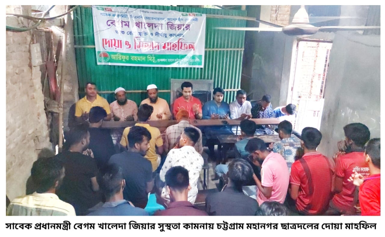 বুধবার (২৬ জুন) বাদ আছর নগরীর খুলশী এলাকায় একটি মাদ্রাসা ও এতিমখানা এ দোয়া মাহফিল অনুষ্ঠিত হয়।এসময় সাবেক প্রধানমন্ত্রী,বিএনপি’র চেয়ারপার্সন দেশনেত্রী বেগম খালেদা জিয়া ও বিএনপির ভারপ্রাপ্ত চেয়ারম্যান জনাব তারেক রহমানের সুস্বাস্থ্য এবং দীর্ঘায়ু কামনা করা হয়।সেই সাথে মহান স্বাধীনতার ঘোষক,বিএনপি'র প্রতিষ্ঠাতা শহীদ রাষ্ট্রপতি জিয়াউর রহমান ও আরাফাত রহমান কোকোর আত্মার মাগফিরাত কামনা করা হয়।