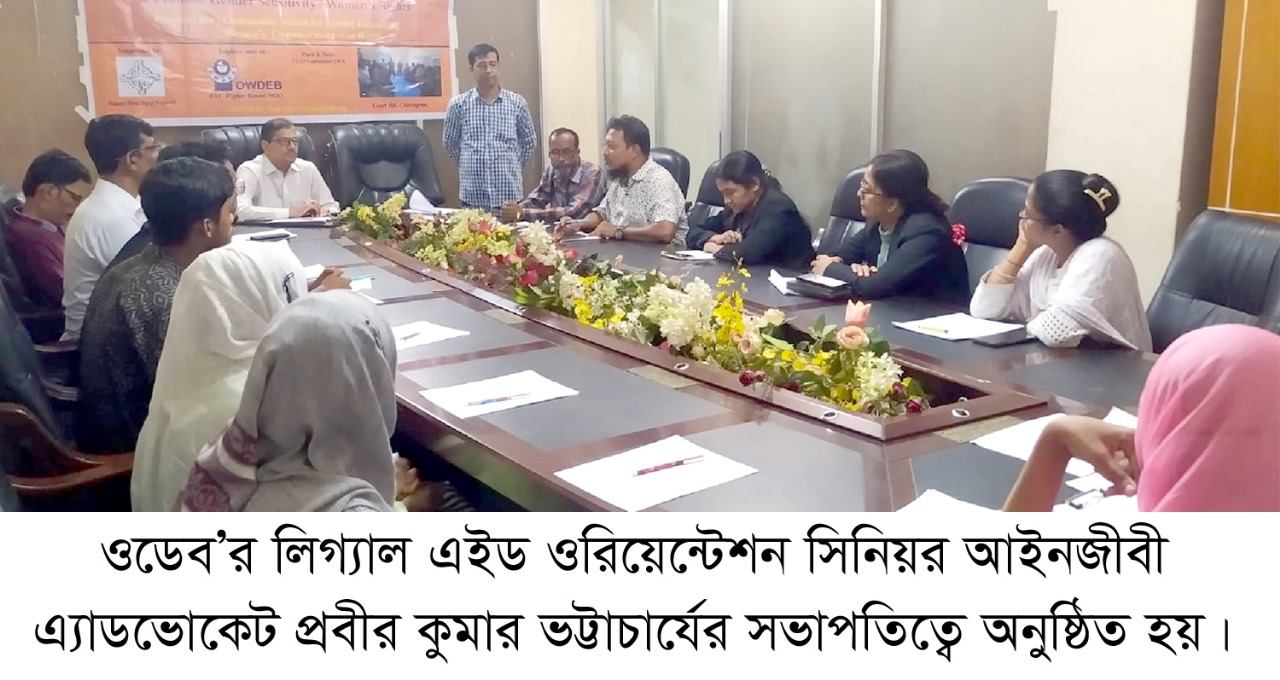 নারীর ন্যায় বিচার, ক্ষমতায়ন ও অধিকারের পক্ষে সামাজিক উদ্যোগ কার্যক্রম বাস্তবায়নে ওডেব’র প্রধান নির্বাহী অধ্যাপক শ্যামলী মজুমদারের সার্বিক তত্বাবধানে ১২ জন আইনজীবী প্যানেল সদস্য ও ১২জন প্রান্তিক আইনী ভবিষ্যত উপকারভোগী শ্রেণীর প্রতিনিধি সমন্বয়ে এ ওরিয়েন্টশন সভা অনুষ্ঠিত হয়।