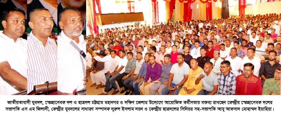 ক্যাপশন: জাতীয়তাবাদী যুবদল, স্বেচ্ছাসেবক দল ও ছাত্রদল চট্টগ্রাম মহানগর ও দক্ষিণ জেলার উদ্যোগে আয়োজিত কর্মীসভায় বক্তব্য রাখছেন কেন্দ্রীয় স্বেচ্ছাসেবক দলের সভাপতি এস এম জিলানী, কেন্দ্রীয় যুবদলের সাধারণ সম্পাদক নুরুল ইসলাম নয়ন ও কেন্দ্রীয় ছাত্রদলের সিনিয়র সহ-সভাপতি আবু আফসান মোহাম্মদ ইয়াহিয়া।