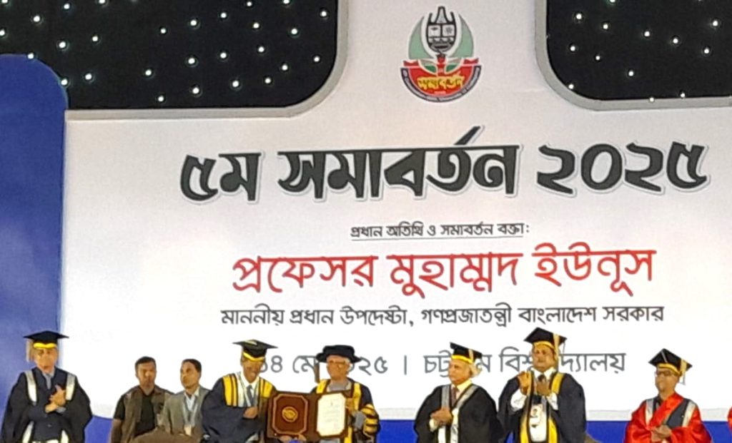 নিউজগার্ডেন ডেস্ক: বিশ্ববরেণ্য ব্যক্তিত্ব ও প্রধান উপদেষ্টা ড. মুহাম্মদ ইউনূসকে সম্মানসূচক ডি-লিট ডিগ্রি প্রদান করেছে চবি। আজ বুধবার (১৪ মে) বিকেলে বিশ্ববিদ্যালয়ের কেন্দ্রীয় খেলার মাঠে আয়োজিত ৫ম সমাবর্তন অনুষ্ঠানে তাঁকে এ ডিগ্রি প্রদান করেন চবি উপাচার্য অধ্যাপক ড. ইয়াহইয়া আখতার। চট্টগ্রাম বিশ্ববিদ্যালয়ের অর্থনীতি বিভাগে ১৯৭২ সালে শিক্ষকতা শুরু করে প্রায় এক দশক বিশ্ববিদ্যালয়ের সঙ্গে যুক্ত ছিলেন ড. মুহাম্মদ ইউনূস। এর আগে দুপুর ২টার দিকে ড. মুহাম্মদ ইউনূস চট্টগ্রাম বিশ্ববিদ্যালয়ের কেন্দ্রীয় খেলার মাঠে উপস্থিত হন। এসময় তাঁকে অভ্যর্থনা জানান বিশ্ববিদ্যালয়ের উপাচার্য, সিন্ডিকেট সদস্য, শিক্ষকরা।