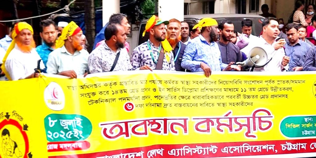 নিউজগার্ডেন ডেস্ক: স্বাস্থ্য সহকারীরা নিয়োগবিধি সংশোধন ও ১৪তম গ্রেডে বেতন-ভাতাসহ ছয় দফা দাবি বাস্তবায়ন চেয়ে চট্টগ্রামে অবস্থান কর্মসূচি পালন করেছে। আজ ৮ জুলাই (মঙ্গলবার) সকাল ৮ টা থেকে চট্টগ্রাম সিভিল সার্জন কার্যালয়ের সামনে বাংলাদেশ হেল্থ এসিস্ট্যান্ট এসোসিয়েশন এর ব্যানারে এই কর্মসূচি পালন করে তারা।
