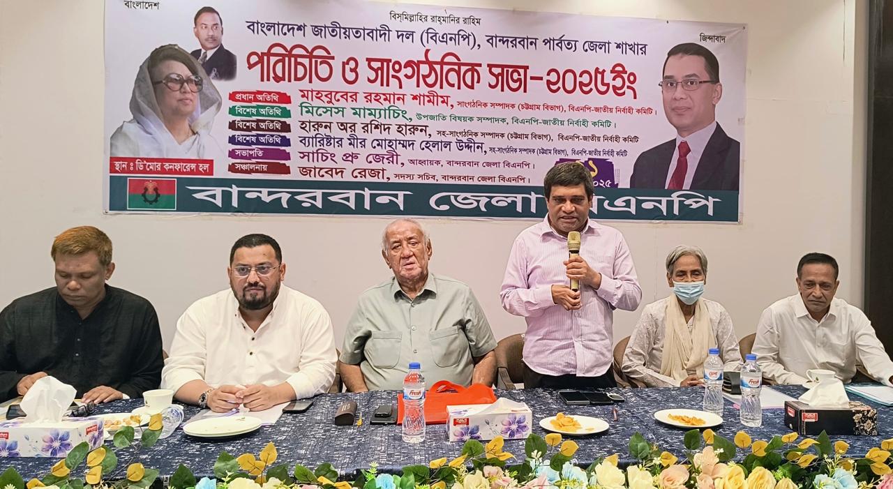 বান্দরবান জেলা বিএনপির আহবায়ক সাচিং প্রু জেরীর সভাপতিত্বে ও সদস্য সচিব জাবেদ রেজার পরিচালনায় অনুষ্ঠিত সভায় বিশেষ অতিথির বক্তব্য রাখেন বিএনপি কেন্দ্রীয় কমিটির উপজাতি বিষয়ক সম্পাদক মা ম্যা চিং, সহ সাংগঠনিক সম্পাদক ভিপি হারুন অর রশীদ হারুন, ব্যারিস্টার মীর মোহাম্মদ হেলাল উদ্দিন।বক্তব্য রাখেন বিএনপির জাতীয় নির্বাহী কমিটির সদস্য মশিউর রহমান বিপ্লব, যুবদল কেন্দ্রীয় কমিটির সাবেক সহ সাংগঠনিক সম্পাদক খালেদ মাহমুদ মাসুদ, স্বেচ্ছাসেবক দল কেন্দ্রীয় কমিটির সাবেক সহ সাংগঠনিক সম্পাদক কবির হোসেন, জেলা বিএনপির সি. যুগ্ম আহ্বায়ক অধ্যাপক ওসমান গনি প্রমুখ।