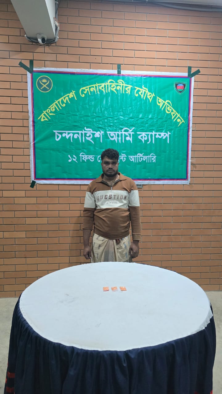 আর্মি ক্যাম্প সূত্রে জানা যায়, গোয়েন্দা তথ্যের ভিত্তিতে শনিবার (৩১ জানুয়ারি) ভোররাত ২টায় সেনাবাহিনীর ১২ ফিল্ড রেজিমেন্ট আর্টিলারি ক্যাপ্টেন ইবতিসাম জাওয়াদ দিয়াব এর নেতৃত্বে একটি টহল দল দোহাজারী পৌরসভার ২ নম্বর ওয়ার্ডস্থ শঙ্খ নদীর দক্ষিণ তীর ঘেঁষে অবস্থিত বার্মা কলোনি থেকে সাহেদুল ইসলাম সজিবকে আটক করে। এসময় তার কাছ থেকে দেড়শ পিস ইয়াবা উদ্ধার করা হয়।