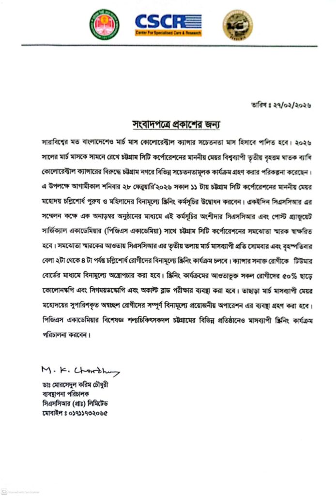 এ উপলক্ষে আগামীকাল শনিবার ২৮ ফেব্রুয়ারি’২০২৬ সকাল ১১ টায় চট্টগ্রাম সিটি কর্পোরেশনের মেয়র চল্লিশোর্ধ পুরুষ ও মহিলাদেও বিনামূল্যে স্ক্রিনিং কর্মসূচির উদ্বোধন করবেন। একই দিন সিএসসিআর এর সম্মেলন কক্ষে এক অনাড়ম্বও অনুষ্ঠানের মাধ্যমে এই কর্মসূচির অংশীদার সিএসসিআর এবং পোস্ট গ্র্যাজুয়েট সার্জিক্যাল একাডেমিয়ার (পিজিএসএকাডেমিয়া) সাথে চট্টগ্রাম সিটিকর্পোরেশনের সমঝোতা স্মারক স্বাক্ষরিত হবে। সমঝোতা স্মারকের আওতায় সিএসসিআর এর তৃতীয় তলায় মার্চ মাস ব্যাপী প্রতি সোমবার এবং বৃহস্পতিবার বেলা ২টা থেকে ৪ টা পর্যন্ত চল্লিশোর্ধ রোগীদেও বিনামূল্যে স্ক্রিনিং কার্যক্রম চলবে।