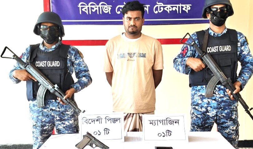 তিনি বলেন, কক্সবাজারের টেকনাফ থানাধীন মহেশখালিয়া পাড়া সংলগ্ন এলাকায় গত ২৩ এপ্রিল ২০২৬ তারিখ বৃহস্পতিবার রাত ১১ টায় কোস্ট গার্ড স্টেশন টেকনাফ কর্তৃক গোপন সংবাদের ভিত্তিতে একটি বিশেষ অভিযান পরিচালনা করা হয়। অভিযান চলাকালীন উক্ত এলাকা হতে ১ টি ৭.৬৫ মি.মি. বিদেশি পিস্তলসহ ১জন কুখ্যাত মানবপাচারকারীকে আটক করা হয়।