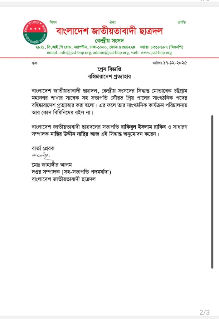 বহিষ্কার আদেশ প্রত্যাহারে সৌরভ প্রিয় পালের কৃতজ্ঞতা, তারেক রহমানকে ধন্যবাদ